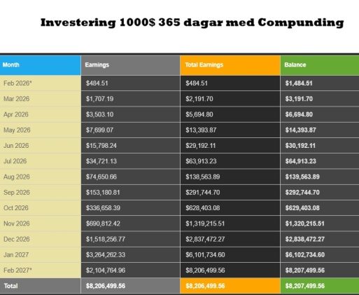 1000$, 365 dagar, compunding ,inga uttag.