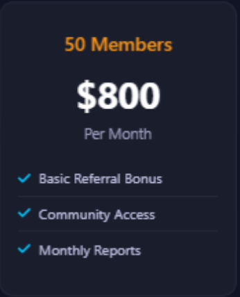 50 eller fler aktiva downlines min. 100$→ Månadslön 800 dollar